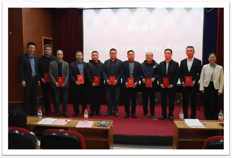 随后,学院学位评定分委员会主席、副院长章子华郑重宣读聘任文件。在全场热烈的掌声中,学院领导为受聘兼职硕士生导师逐一颁发聘书并合影留念,这标志着各位行业翘楚正式加入学院研究生培养队伍,成为协同育人路上的重要伙伴。章子华教授在发言中向受聘导师表示热烈祝贺,他指出,各位新聘导师深耕的专业领域,既是学院学科建设的核心方向,更是支撑区域高质量发展的关键领域。兼职硕士生导师是学院研究生培养体系的重要组成部分,希望各位导师充分发挥行业资源优势与丰富实践经验,与校内导师同心协力、优势互补,助力研究生成长为兼具理论深度与实践能力的复合型高素质人才,为行业发展注入新生力量。